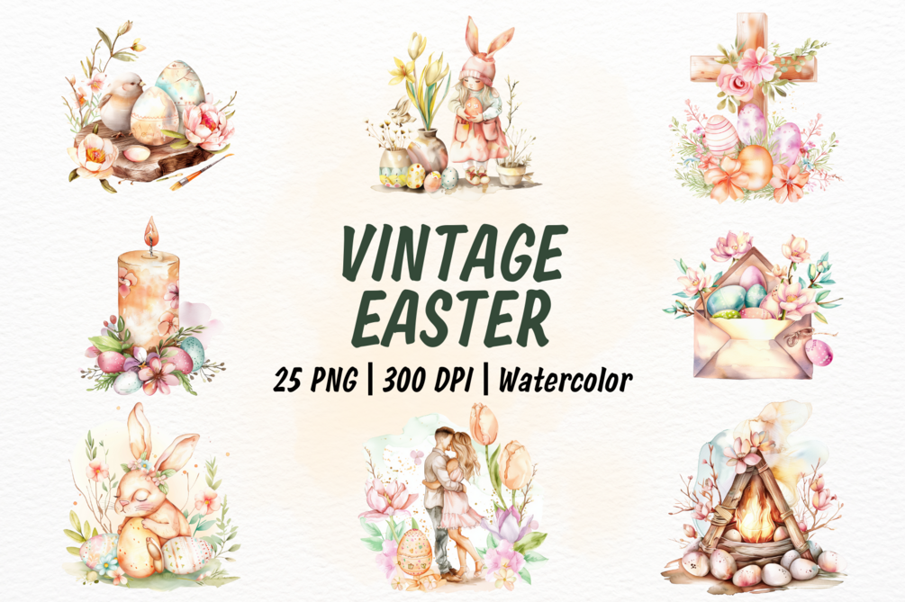 Set of 25 high resolution watercolor Vintage Easter clipart. This bundle of clipart comes in watercolor style. All clipart white background has been removed for user convenience. After purchase, the clipart with a transparent background can be easily added to a variety of designs for creating products.