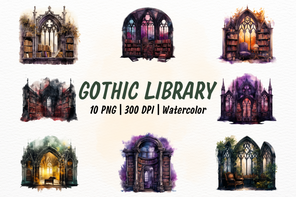 Set of 10 high resolution watercolor gothic library clipart. This bundle of clipart comes in watercolor style. All clipart white background has been removed for user convenience. After purchase, the clipart with a transparent background can be easily added to a variety of designs for creating products.